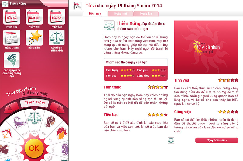 | Tính năng nổi bật | Xem tử vi hàng ngày cụ thể hôm nay/ngày mai/ngày kia kèm lời khuyên chi tiết từng cung; hỗ trợ tính toán bói toán cá nhân tuỳ sinh nhật cụ thể |